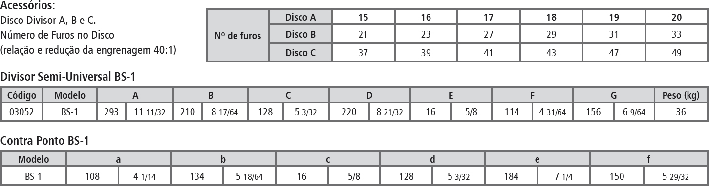 Este modelo tem uma placa de indexação direta com 24 furos possibilitando a divisão direta de 2, 3, 4, 6, 8, 12 e 24 posições. Outras três placas de indexação são fornecidas para facilitar a divisão indireta de todas as posições de 2 a 50 e das posições mais utilizadas até 380.