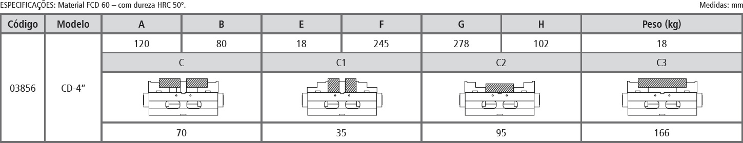 Mordentes projetados para diversas possibilidades de aperto da peça de trabalho. O mordente central pode ser removido para fixar uma peça de tamanho maior.
